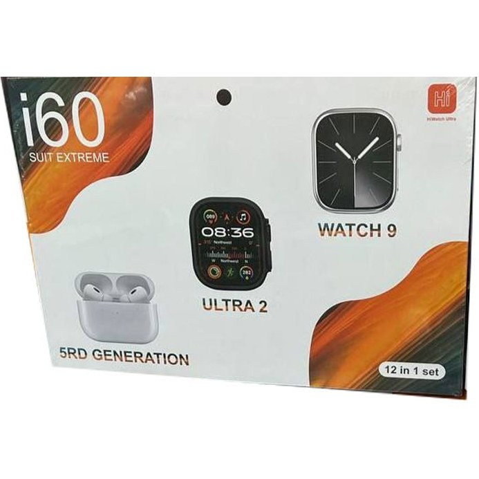 پک ساعت هوشمند i60 suit extreme دارای دو ساعت و ایر پاد و دو محافظ 7 بند پشتیبانی از فارسی صفحه amoled ضربان قلب و اکسیژن و...